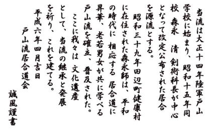 森永先生は、かって自ら研究し、制定し、公表した「戸山流居合」を、新しい平和の時代に相応する居合道に昇華、 老若男女が共に学べる「戸山流」を確立、普及に努められた。